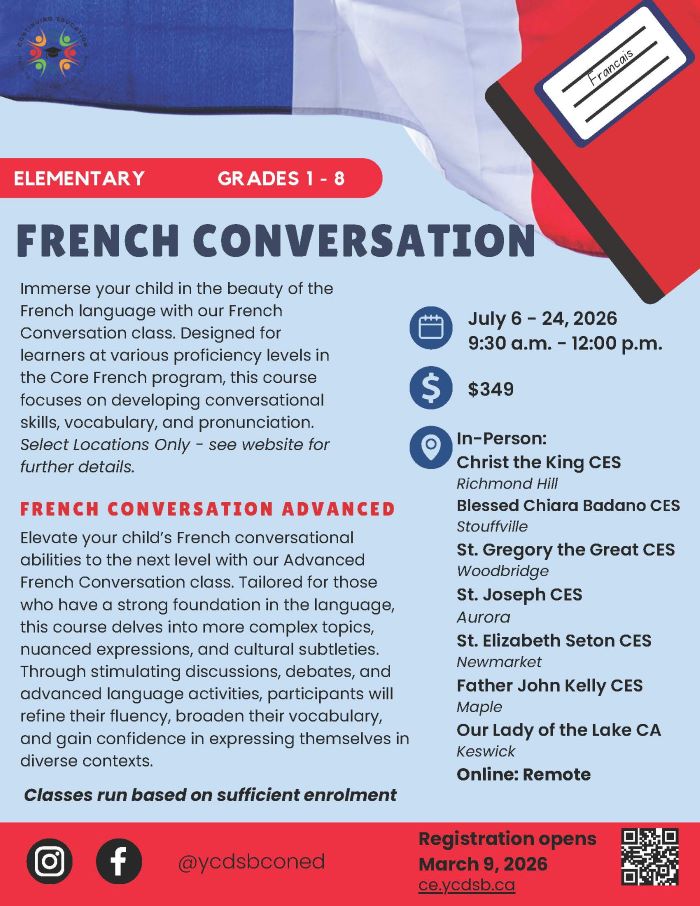 Whether you’re in regular stream French or French Immersion, if you’re looking to boost your conversational skills, this program is for you! We’ll enhance your listening, speaking, reading, writing, and grammar, focusing on expanding your vocabulary and mastering French structure. Through a variety of engaging strategies, you’ll gain greater language proficiency. Our classes ensure plenty of opportunities to practice speaking with your instructor and classmates, helping you reach your French fluency goals. For our remote program, students will need access to a computer and the Internet which features synchronous and asynchronous learning opportunities.