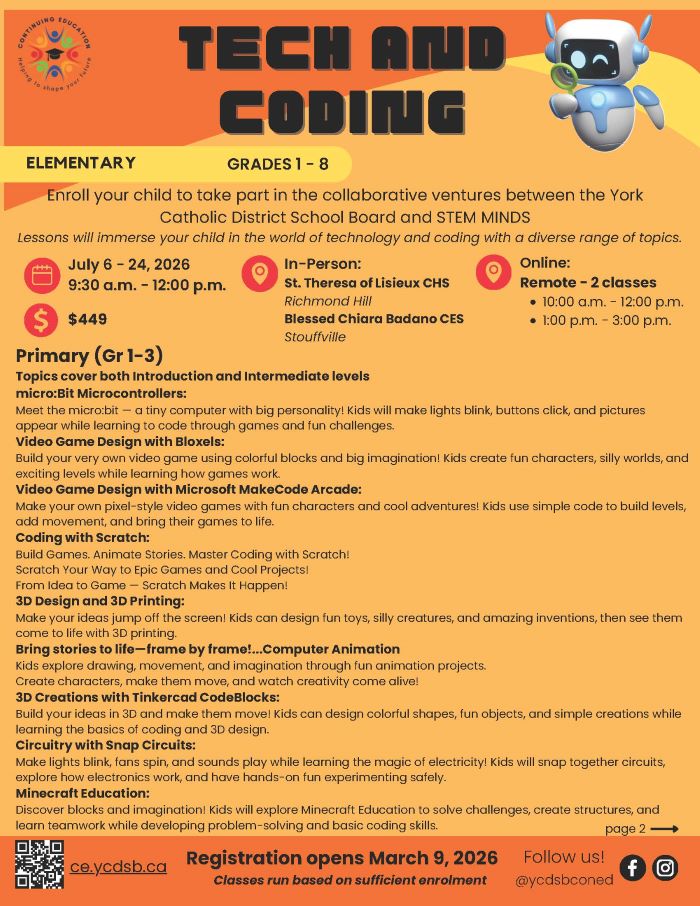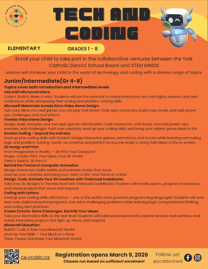 Build the future with YCDSB and STEM Minds! We’re bringing world-class tech and coding education to Grades 1–8. Our collaborative program turns students into creators through hands-on STEM projects that build confidence and future-ready skills. Don’t just learn about the digital world—lead it!
